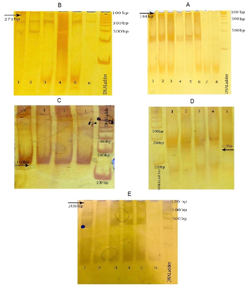 In order to perform PCR-SSCP, PCR products of different samples were analyzed by polyacrylamide gel electrophoresis. First, the PCR products were incubated at 95°C for 5 minutes for denaturation and were then immediately transferred to an ice-chilled container. Polyacrylamide gel (12%) was used to perform SSCP vertical electrophoresis system. Subsequently, 5 µl of PCR product was added to 5 µl SSCP buffer (formaldehyde 95%, sodium hydroxide 10 mM, bromophenol blue 0.05%, and xylene cyanol 0.05%), and the mixture was loaded into electrophoresis wells. Electrophoresis was performed for 5 hours at 70 V in a 0.6 TBE buffer. The gel was stained with silver nitrate. For this purpose, the gel was placed in solution A (ethanol 10% and acetic acid 0.5%) and was then transferred to solution B (silver nitrate 0.1%) for 10 minutes. It was eventually placed in solution D (Sodium bicarbonate) and was scanned after washing with distilled water.