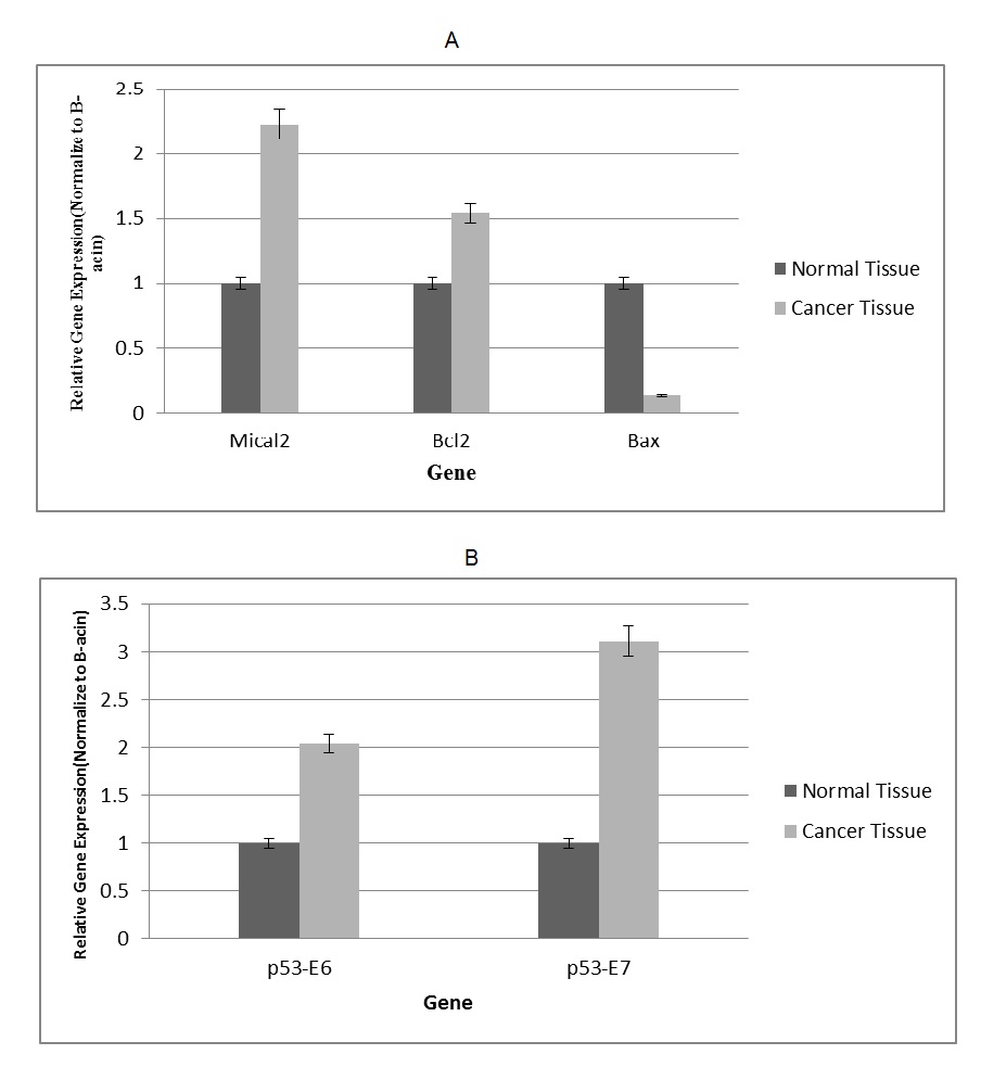 According to the results of the RT-qPCR method (evaluating and measuring the expression of BAX, Bcl-2, and MICAL2 genes), the increase in MICAL2 gene expression in tumor tissue was 2.2 fold compared to that of healthy tissue, and Bcl-2 gene expression was 1.54 fold relative to that of healthy tissue. The reduction in Bax gene expression in tumor tissue was 0.87 fold compared to normal tissue (Fig. 6A). Using RT-qPCR, expression results of exons 6 and 7 from the p53 gene on tumor and adjacent normal tissues in gastric cancer patients indicated the increase in p53 gene expression of gastric tumor tissue to be significantly higher than that of healthy. According to this research findings, the expression of exon 6 of the p53 gene in tumor tissue was 2.04 fold compared to the healthy one; also, the expression of exon 7 of this gene and tumor volume was 3.11 fold relative to that of normal (Fig. 6B).