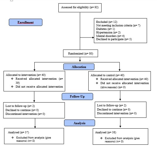 Three people from the intervention group were excluded from the study due to various reasons (non-participation in the workshops, diagnosis of diabetes with kidney and eye complications, complete rest due to pregnancy) and 2 people from the control group were excluded from the study due to not completing the questionnaires, and finally 75 people were included in the study.