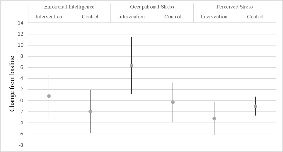Fig. 2. Absolute change from baseline in emotional intelligence, occupational, and perceived stress. Error bar indicate 95% confidence interval.